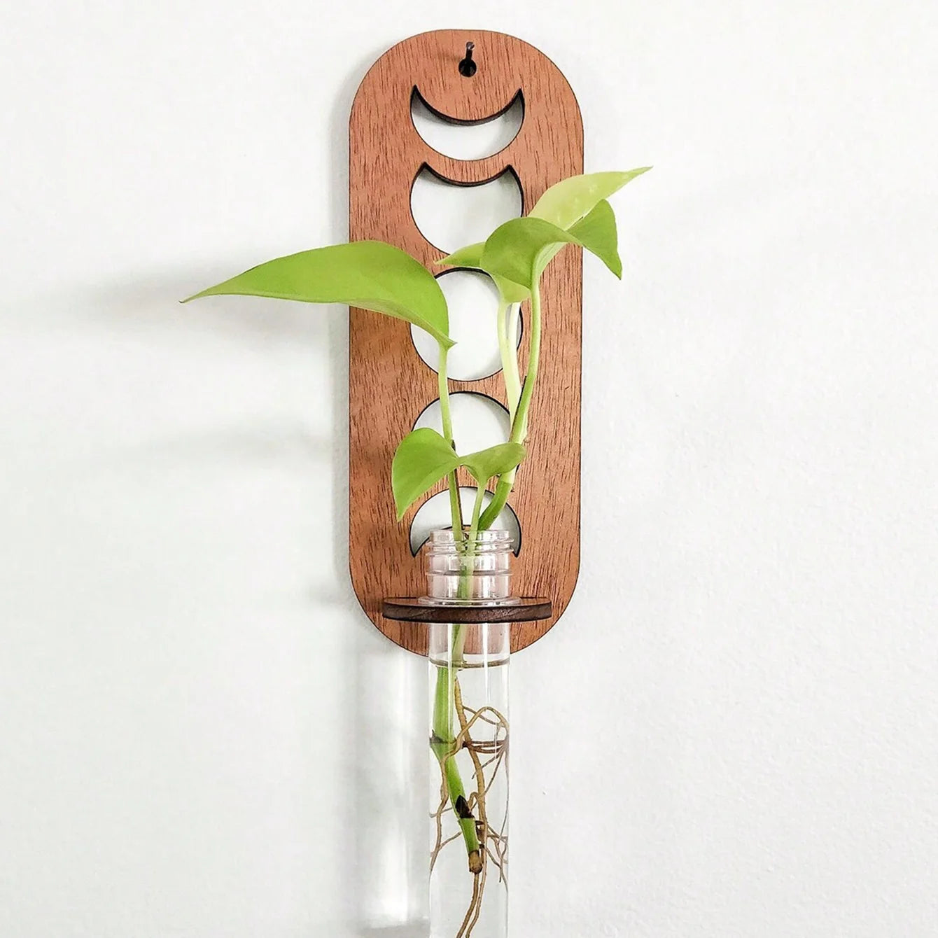 Perfect for plant lovers and design enthusiasts alike, this propagation station is more than just functional—it's a statement piece. The moon phase cutouts on the wooden backing evoke a sense of calm and balance, while the glass test tube offers a modern touch, ideal for showcasing vibrant plant cuttings or fresh flowers.